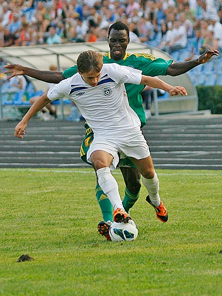 Голевых моментов в довольно скучном первом тайме почти не было. Гости считанные разы дошли до штрафной Товта, а николаевцы в первый раз по-серьезному потревожили Жданкова лишь на 33-й минуте - Джгереная со штрафного выстрелил в нижний угол, голкипер «Авангарда» отбил мяч перед собой, но набежавший Сергийчук не сумел поразить цель. В одной из следующих атак у Михаила был еще один великолепный шанс для взятия ворот, однакои он не попал в рамку метров с семи. Впрочем, главным действующим лицом на поле в первом тайме был не этот форвард МФК «Николаев», а главный арбитр Николай Кривоносов из Киева. Он раздавал желтые карточки направо и налево, а однажды взмахнул и красной - под занавес первой половины игры в довольно спорной ситуации с поля был удален защитник хозяев Брынько. Любопытно, что в минувшем сезолне он защищал цвета … краматорского «Авангарда».
