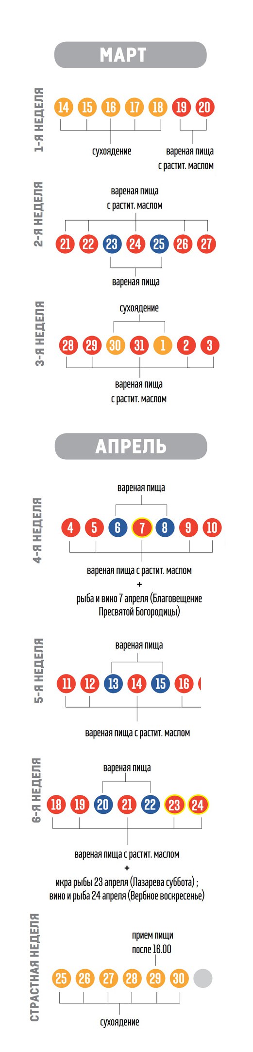 Самыми строгими периодами поста являются 14-20 марта и 25-30 апреля.