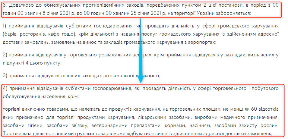 В постановлении Кабмина №1236 о карантине говорится, что с 8 по 24 января торговать разрешат только тем магазинам и супермаркетам, где не менее 60% пощади занимают такие товары: