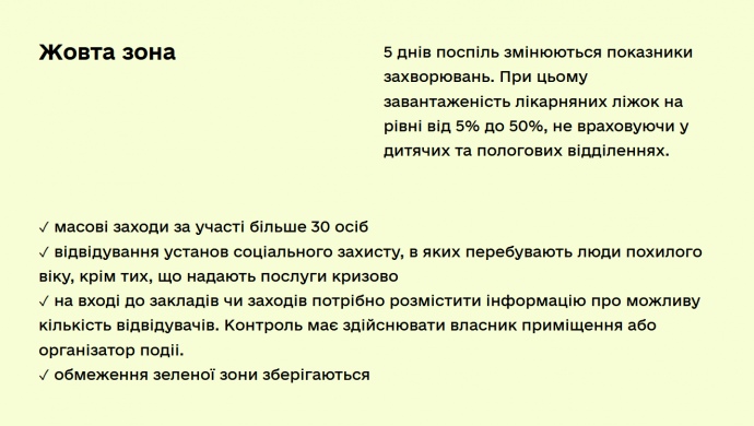В «желтую зону» входят Киев, Волынская, Днепропетровская, Кировоградская, Львовская, Одесская, Полтавская, Сумская, Харьковская, Херсонская, Хмельницкая, Черкасская и Черниговская области.