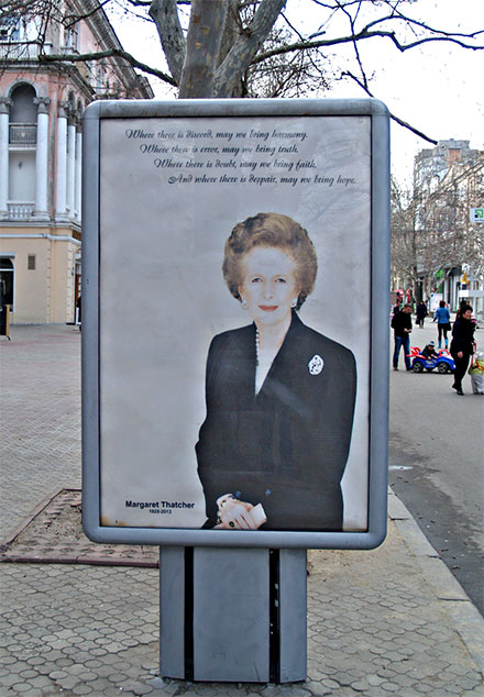 С нескольких сити-лайтов на центральных улицах города на николаевцев «смотрела» «железная леди», изображенная на белом фоне. Вверху постера расположили фразу на английском языке, которую выдающийся политик произнесла, когда вступила в должность премьер-министра Великобритании в 1979 году. В переводе на русский надпись звучит так: «Там, где есть разногласия, мы можем привнести гармонию. Там, где есть ошибка, мы можем принести истину. Там, где есть сомнения, мы можем принести веру. А там, где отчаяние, мы можем дать надежду.».