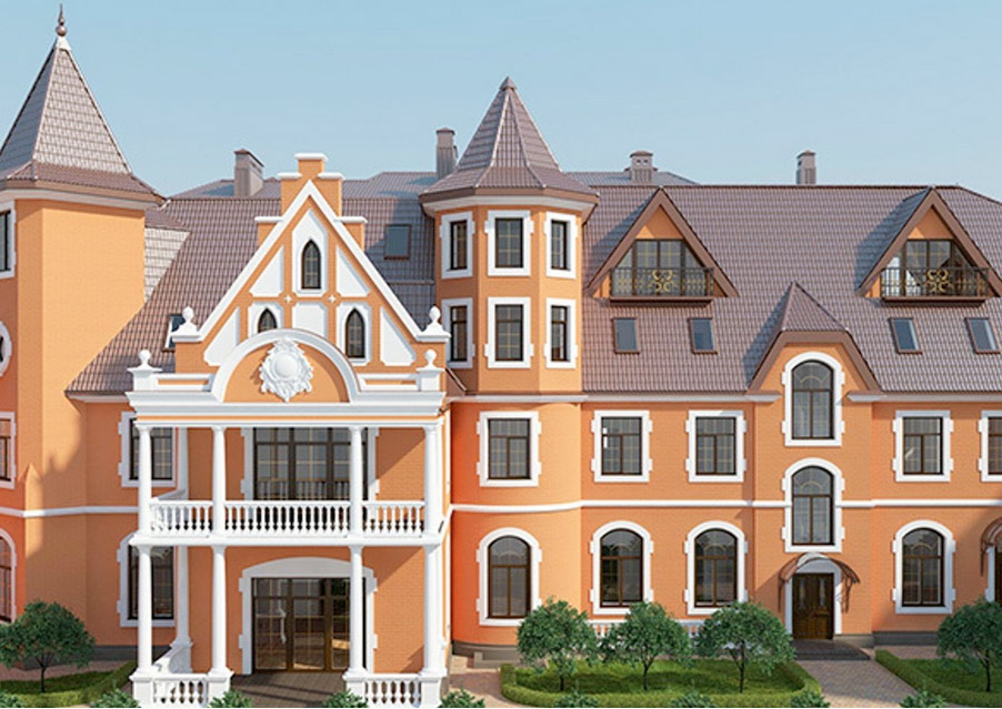 В то время как многие новостройки Украины получают от застройщика фасад в стиле модерн, хай-тек, скандинавия или модернизм, этот проект выполнен в виде старинного замка. Крыша многоквартирного дома перекрыта металлочерепицей темного цвета, на стеклопакетах «под дерево» есть шпросы, на мансардных этажах есть балконы под двускатной крышей. Еще эффект дополняется наличием балюстрад, лепнины и кованые ограждения.
