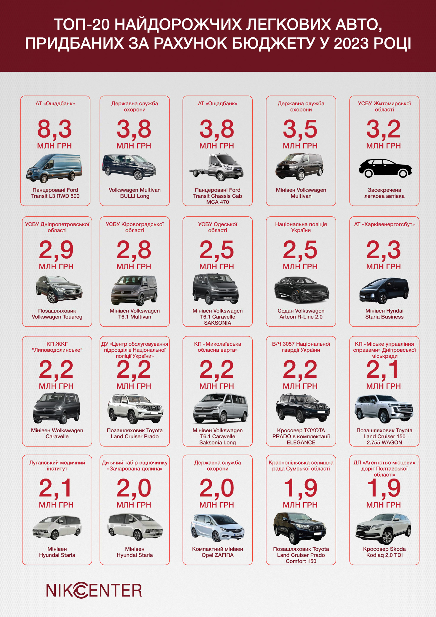Nikcenter проаналізував бюджетні закупівлі і виділив топ-20 найдорожчих авто, які закуповували в Україні в 2023 році.
